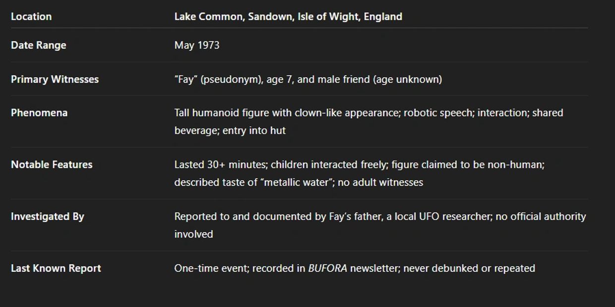 In May 1973, on the Isle of Wight near Sandown, a young boy known as "Fay" and a friend encountered something utterly bizarre while walking near a golf course. After hearing a strange wailing siren, they crossed a small wooden bridge and came upon a large, clown-like figure standing in a field. The being was nearly seven feet tall, with pale skin, large triangular eyes, and red markings across its face. It wore a tunic, gloves, and a tall hat — all mismatched in shape and color — and its speech was robotic and hesitant. The figure introduced itself as "Sam," claiming not to be human and stating it had no name in the way humans understand names.