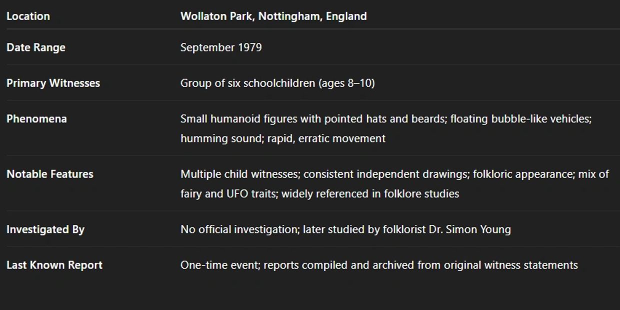 In September 1979, in Wollaton Park, Nottingham, England, a group of six schoolchildren claimed they encountered a troop of small, humanoid figures resembling gnomes while playing near a pond after dark. According to their accounts, the figures stood about two feet tall, wore pointed hats and had long white beards. The children described the gnomes as moving in bubble-like vehicles that floated above the ground and emitted a buzzing or humming sound. The encounter allegedly lasted around 15 minutes before the figures vanished. The children, aged between 8 and 10, independently provided strikingly similar stories and drawings shortly after the event.