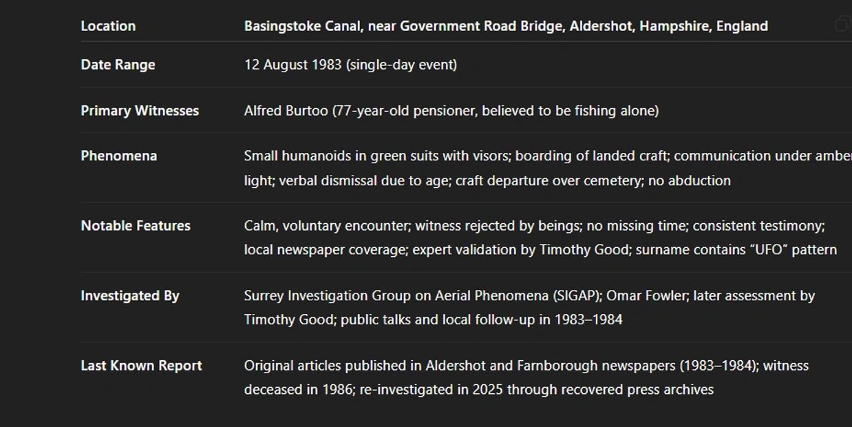 In August 1983, 77-year-old Alfred Burtoo was fishing by the Basingstoke Canal in Aldershot, Hampshire, when he claimed he was approached by two small humanoid figures wearing green suits and visors. They gestured for him to follow, and he calmly accompanied them to a landed, metallic craft resting on two ski-like supports. Inside, he was asked to stand beneath an amber light. After a brief moment, a voice — described as sing-song, with a strange accent — informed him that he was too old and infirm for their purpose. He was told he could leave. The craft departed, and Burtoo resumed his fishing.